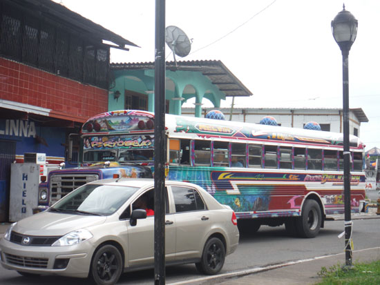 Paikallisbussit on vanhoja amerikkalaisia koulubusseja, vain maalattu uusiksi.