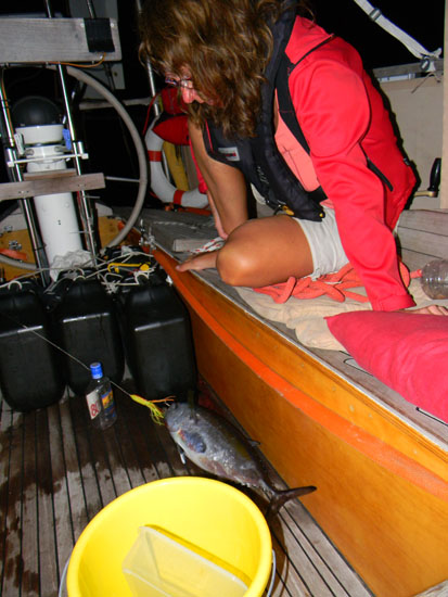 San Blasille tultaessa saimme noin kolmekiloisen tonnikalan, joka tapettiin siististi Saarenmaan jämillä.