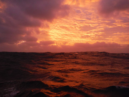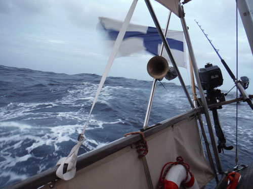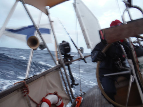 Kaikkeen tottuu, myös veneen keikkumiseen ja isoihin aaltoihin. Ensin näyttää siltä, että kolmimetrinen aalto vyöryy juuri perästä yli ja täyttää sitloodan, seuraavassa hetkessä aalto on kadonnut ja kun katsoo perän yli, onkin tyhjää pudotusta kolmisen metriä ja seuraava möykky on jo tulossa. Panthera pärjää hyvin ja nousee kerta toisensa jälkeen perästä vyöryvän aallon päälle -toisinaan kallistuen 40 astetta ensin toiselle puolelle ja heti uudelleen toiselle puolelle niin, että vesi nousee sivukansille ja puomin pää lähes kyntää vettä.