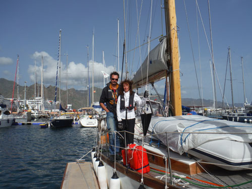 Teneriffalle Santa Cruzin satamaan olemme saaneet hyvät ajo-ohjeet Calimeran Nikeltä: käännytte vaan oopperatalon kohdalta oikealle satamaan. Oopperatalo tai oikeammin Auditorium näkyy kauas merelle erikoisena arkkitehtoonisena muusta maisemasta poikkeavana rakennuksena, todella hyvä maamerkki. Ilmottaudumme VHF-radiolla ensin sataman kulunvalvontaan ja saamme kehoituksen jatkaa suoraan altaan perällä olevaan vierassatamaan Marina Atlanticoon. Kutsumme radiolla myös marinaa, "täällä ollaan tulossa, oletteko kotona?" Laiturilla huhuilee jo Nikke ja marinerokin ilmestyy kumiveneellään näyttämään meille sopivaa paikkaa ulommaisesta pistolaiturista -hyvä paikka, tästä päästään joskus poiskin mukavasti. Kiinnitämme Pantheran köydet ja saamme marinerolta ohjeet tulla hakemaan vessan kulkukortti myöhemmin häneltä, toimisto on kiinni, koska on sunnuntai ja muutenkin jokin juhlaviikonloppu. Laiturille ilmestyy lisää suomalaisia, Ilkka ja Sinikka, s/y Katariinan päällystö ovat myös täällä valmistautumassa Karibialle lähtöön. Ilkan kanssa olemme tavanneet ennen reissuun lähtöä Helsingin Sirpalesaaressa -on se kumma, miten pitkä matka on pitänyt seilata ennen kuin tapaamme uudelleen. Auringon paistaessa vaihdamme laiturilla kuulumisia ja nautimme Sinikan tarjoamista tervetulo-oluista, kotipaikkakunta on taas vaihtunut.