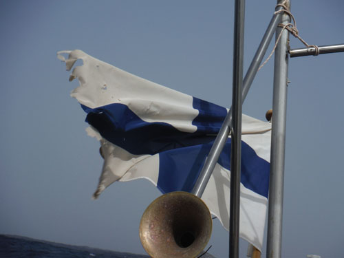Lähtiessä on pilvipouta, tuuli tulee erittäin heikkona ja vastaisena, ajelemme koneella keulapurje "tukena". Päätämme nauttia heti uunissa odottavasta makaronilaatikosta, kun keli on vielä siihen sopiva. Parin tunnin ajelun jälkeen kuuluu outo tärisevä ääni, mitä nyt? Vasta-asennetun vesipumpun kiinnikkeet ovat pettämässä, sammutamme äkkiä moottorin ja jatkamme pelkällä tuulienergialla. Se energia on vaan hyvin vähäistä ja väärästä suunnasta, Panthera lilluu paikallaan ja lipuu jopa taaksepäin yrittäessämme väistää kalastuspalloja. Juha uurastaa tunnin konehuoneessa ja olemme palanneet sähköpumppukauteen. Kuulostaa helpolta, mutta asennushommaa hankaloittaa meren möyhentävä vaikutus. Noin puolentoista metrin aallot saavat Pantheran vellomaan tuulettomalla merellä, ilman tuulta ja heiluntaa tukevoittavia purjeita meno on todella keikkuvaa. Kuuman moottorin vierellä työskentely pää alaspäin taitaa olla yksi tehokkaimpia keinoja hankkia meripahoinvointi:-)