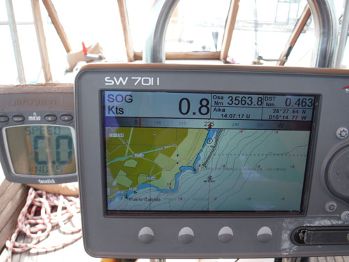Merellä on reilu 3-4 metrin aallokko kylkeen. Purjehdimme kovassa keikutuksessa pelkällä genualla. Ohjauksesta vastaa autopilotti yhdessä tuuliperäsimen kanssa. Vihdoinkin tuuliperäsin kestää kiinnikkeissään ja tekee hommia koko matkan. Meri pitää huolen siitä, että ruokaa ei tällä matkalla kulu. Menu sisältää vettä, jääteetä, pähkinöitä ja kananmunan -onko ihme, että housut ei pysy ylhäällä ja vyöhön joutuu tekemään lisäreikiä. Voisimme tarjota laihdutusristeilyjä kaikille haluaville, parempaa menetelmää kilojen putoamiseen ei ole. Osa päällystöstä on niin pahoinvoiva, että tyhjentää niukankin ruokavalion kaloille ensimmäisen päivän aikana. Teneriffalla ensimmäinen tehtävä tulee olemaan pahoinvointilääkkeiden hankinta, onneksi Suomessa on tuttu lääkäri ja sisko perheineen tulossa lomamatkalleen meitä tapaamaan.