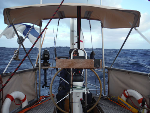 Toisen vuorokauden lopulla tulee ongelmia, autopilotti on lakkoillut ja lopettaa nyt toiminnan kokonaan. Autopilottiinhan säädetään haluttu kompassisuunta, jonka jälkeen sen kuuluu ohjata valittuun suuntaan. Mutta tämä pilotti kadottaa halutun suunnan jo muutaman minuutin ajon jälkeen, se ei selvästikään halua tehdä töitä. Piuhojen ja liitäntöjen tarkastus ei tuo apua asiaan. Pidämme tuumaustuokion, vaihtoehtoja on kaksi: palata takaisin Kanarian saarille 10-14 m/s vastatuulessa ja vasta-aallokossa reilun parin vuorokauden ajan tai jatkaa eteenpäin ilman autopilottia. äänestämme 2-0 jatkamisen puolesta, ehkä päivän valossa saamme autopilotin toimimaan ja onhan meillä tuuliperäsin, jota edellisellä reissulla jo käytimme. Yön kuitenkin menemme käsiohjauksella, sehän on tuttua hommaa, ei mitään ihmeellistä.