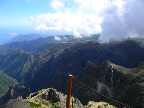 Ensimmäisen viikon leikimme turistia, vuokraamme auton (köyhinä veneilijöinä vuokraamme auton netissä ja haemme lentokentältä, paljon halvempaa kuin suoraan satamasta vuokrattuna) kolmeksi päiväksi ja ajelemme saarta ristiin rastiin. Madeira on todella mäkinen saari, jossa kaikki mahdollinen tila on hyödynnetty pengertämällä viljelyksille, rakennuksille tai autoteille. Nykyään suurin osa teistä kulkee tunneleita pitkin, ajellessa mietimme, miten reikäinen tämä saari tunneleineen onkaan. Saaren itäpää, jossa satamamme on, on selvästi kuivempi ja karumpi, mutta heti rannalta sisämaahan päin löydämme vihreyden ja vehreyden. Saaren korkeimmat vuoret ovat Pico Ruivo (1 862 m), Pico das Torres (1 851 m) ja Pico do Areeiro (1 818 m), joista matalimmalle kurvaamme autolla aikomuksenamme kävellä ylhäällä polkua pitkin Pico Ruivolle. Ylös ajaessa tie kiemurtaa vuorenrinnettä serpentiininä, kasvillisuus muuttuu pohjoismaisen oloiseksi, lehtipuissa on jopa ruskan värit. Huipulle päästäksemme ajamme pilven läpi, harvemmin sitä näin ylhäällä ollaan. Perillä on melko kylmä, onneksi mukana on pitkähihaista vaatetta. Katselemme mahtavia maisemia ja tietysti valokuvaamme. Tyydymme parkkipaikan läheisyydessä olevaan näköalapaikkaan emmekä lähde vaeltamaan, koska sateinen pilvirintama peittää koko toisen huipun puoleisen rinteen, emme kuitenkaan näkisi mitään varpaitamme pidemmälle.