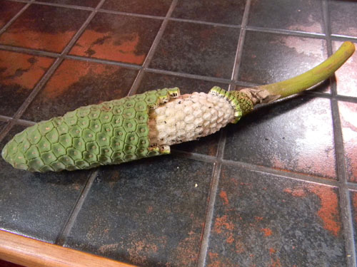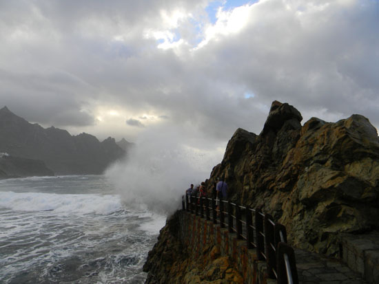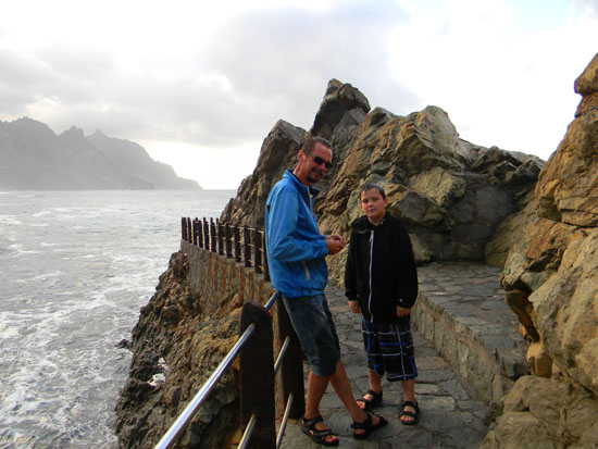 Seuraavana aamuna paistaa aurinko ja tuulee lujaa. Teemme Miikan kanssa pyöräretken 8 km päässä sijaitsevalle hienolle Teresitaksen rannalle, Juhan jätämme venehommiin. Menomatkalla on vastatuuli ja rannalla tuulen pöllyttämä hiekka pistelee iholla ja silmissä, mutta me nautimme auringosta, lämpimästä merivedestä ja kylästä ostetuista eväistä. Paluumatkalla on onneksi myötätuuli:-) Iltapäivällä ajelemme autolla ylös vuorelle suuntana Taganana, 1500-luvulla perustettu kylä, johon tie saatiin vasta vuonna 1968. Vuorella kasvaa kaktuksia ja kaktuksissa hedelmiä, poimimme niitä maisteltavaksi (hedelmiin ei kannata koskea paljain käsin, piikkejä on!). Vuorelta lähtee tie alas saaren pohjoisrannalle Tagananan kylään ja mustahiekkaiselle uimarannalle. Isot mainingit vyöryvät rantaan, rohkeimmat surffarit lautailevat aalloilla. Kävelemme rannasta ulossuuntautuvalle kallioniemelle, jossa on näköalatasanne. Hetken katselemme aaltojen vyöryntää, mutta tilanne näyttää rauhalliselta, joten uskaltaudumme viimeiselle kaiteelle asti. Olemme jo lähdössä takaisin rantaan, kun tulee iso aalto ja vyöryy ylitsemme. Hetkessä olemme keskellä vesipatsasta. Märkinä ihmettelemme ja nauramme tapahtunutta. Koska mitään vaaraa ei ole, käyvät miehet vielä uudelleen niemessä. Hetken odottelun jälkeen tulee todella iso maininki ja miehet häviävät veden sisään -mahtavaa, paljon parempaa kuin missään vesipuistossa!!