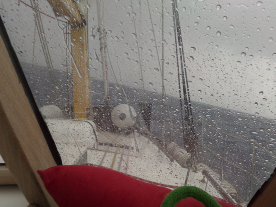 Loppumatkasta pilvi- ja saderintama saavuttaa meidät. Vettä tulee isosta esteristä niin, että jo näköetäisyydellä ollut kallioranta katoaa kokonaan -onneksi meillä on AIS ja tutka, joista näemme mahdolliset vastaantulijat (paitsi pienemmät kohteet kuten vastaantuleva pieni kalastusvene, jonka erotamme vasta paljaalla silmällä melko lähellä). Salama välähtää ja ukkonenkin jyrähtää pari kertaa, ehdimme juuri ukkosrintaman alta karkuun.