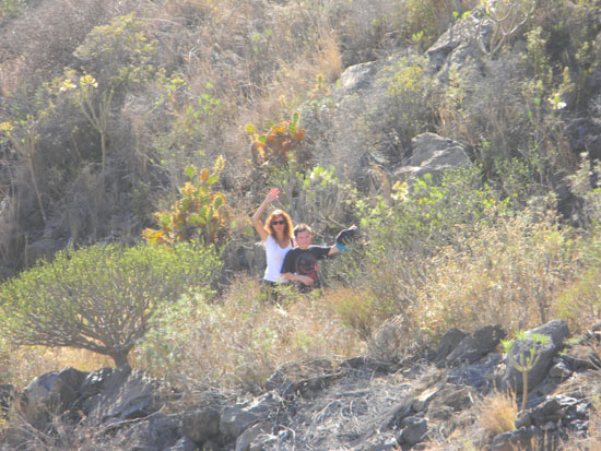 Viikon verran olemme turisteja ja kierrämme koko saaren ympäri autolla. Saaren itä- ja länsipuoli ovat aivan erilaisia ilmastoltaan ja luonnoltaan. Länsiranta on kuumempi, kuivempi ja ruskeampi, itäranta taas viileämpi, sateisempi ja näistä syistä johtuen selvästi vihreämpi. Miikan kanssa teemme myös patikkaretken länsipuolella oleville kukkuloille. Ensin yritämme Barranco Infiernoon menevälle polulle, polun päässä pitäisi olla korkealta tulevat vesiputoukset, mutta koko polku on suljettu maanvyörymien vuoksi. Valitsemme läheltä löytyvän polun, joka johtaa ylös rinteille. Puolentoista tunnin kävely ylämäkeen saa meidät kaikki vähän puuskuttamaan ja vain Juha käy ihan ylhäällä ottamassa valokuvia.