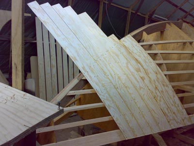 höyläpenkkinä. Keulan iroko tukkia rakennettiin pitkään ja hartaasti, mutta siinähän se on menossa paikoilleen. Jopa katos kesti köysien painon . |