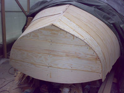 27.4.-08 Viimeinkin yö pakkaset loppuivat ja uskalsi aloittaa tuon rungon liimaamisen. Yllättävän hyvin tuo 6,5mm soiro taipuu noihin muotoihin. Mutta tuskallisen hidasta touhua, jokainen soiro täytyy erikseen höylätä ja sovittaa ennen liimaamista. Reilu neljännes ensimmäistä kerrosta menossa... Olosuhteet olleet ihanteelliset, lämpötila 17 astetta kosteus 40-55 prosenttia |