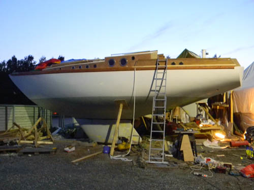 Viimeinkin teltta lähti ja vene nostettiin kölinsä päälle... ![]() Viimeinkin pääsi itsekin ihailemaan viiden vuoden työn tulosta, kun saatiin teltta pois päältä ja vene kölinsä päälle. Tähän saakka kun sitä oli katsellut pimeässä teltassa metrin päästä, niin kokonaisuus oli vain arvailujen varassa. Sieltähän tuli esiin sulavalinjainen vene... Ja kaiken kukkuraksi se seisoi kuin tatti pelkän kölinsä varassa, ilman yhtäkään tukea. Vielä vaatii tuon loppurutistuksen jotta saadaan vesille, mutta kyllä se muutaman viikon kuluttua ui... Loppurutistus kesää kohti... ![]() Sulaa lyijyä kattilasta muotin pohjalle... Paljon on vielä tekemistä ennen vesille pääsyä. Köli on viimeinkin valettu ja viimeistelyä vaille. Rungon maalaus ja peräsimen teko on kovimmat hommat jäljellä sekä tietysti moottorista koesavujen saanti... Vastauksia uteliaille ja vähän muillekin... Venetyypin valinta oli muutaman vuoden työn tulos, paljon epäröintiä ja tutkiskelua. Kaipasin nopeaa venettä ja olinkin jo kallistumassa katamaraaniin tai jopa trimaraaniin. Pääsin pienelle koepurjehdukselle Lagoonin katilla ja kulku sillä oli kuin olisi junalla mennyt. Ei kallistellut ja noin 6 metrin tuulella tasaista menoa. Puuttui se jokin purjehduksen tuntu johon oli oppinut vanhalla kunnon raaserilla. Lisäksi löysin riittävän monta kuvaa missä katti oli mennyt nurin (tosin monta kuvaa kisoista). Harkinta palasi jälleen yksirunkoisiin, koska koin sen turvallisemmaksi vaihtoehdoksi, painolastikölin vuoksi kun vene pyrkii aina nousemaan pystyyn... En halunnut mitään nykyaikaista leveäperäistä surffivenettä, vaan klassisen mallisen purjeveneen. Aikani meni selatessa nettiä ja etsiessä veneitä, sekä kunnostettavia runkoja että piirustuksia. Melkein jo ostin Vaasasta betoniveneen, joka oli tarkoitus laittaa kuntoon. Se oli melkoisen lähellä noita muotoja ja koepurjehduksella osoittautui kohtuullisen nopeaksi ja hyvin purjehtivaksi veneeksi. Runko oli vain halki kölin takaa ja alkoi vuotaa noston jälkeen kuin seula, eli vedetty kiville ihan kunnolla. Aloin piirtää itse noin 12 metristä venettä ja melkein loppuun sainkin piirrettyä, mutta silloin löysin nuo Hartleyn mallit ja ihastuin noihin rungon muotoihin. Piirustukset saatuani huomasin, että omat itse piirretyt kuvat olivat lähes samanlaiset sekä sivu profiililtaan että kaariltaan. Itsepiirretyissä oli leveyttä 15 cm enemmän, muutoin samat muodot. Vanha Unique oli tehty ristiinlaminoimalla mahonkiviilusta ja runko oli todella luja ja jäykkä. Lisäksi menelmä sopi oikein hyvin itserakentajalle. Ja puu on materiaalina se mikä taipuu minun käsissäni... Päätin varmuuden vuoksi ottaa Hartleyn piirustukset pohjaksi ja tehdä rungon niiden mukaan. Kansi ja sisusta onkin sitten täysin omaa suunnittelua. Kaikki on päässä ja näkymä valmiista veneestä on olemasa vain tässä tyhmässä päässä, koitahan siitä sitten tehdä valmista... kohtuu hyvin siinä on onnistuttu. lakkapintojen sävykin oli päässä ja siinähän se urakka olikin että se löytyi... monta kokeilua petsien ja lakkojen kanssa tehtiin ja lopulta väri on sekoitettu itse eri mahonkipetsien sävyistä ja kerroksilla saatu värin syvyys esille. Alumiini- vai puumasto Kauan tuotakin arvottiin... Alkujaan halusin puumaston ja sellaisesta jo tarjouksetkin pyysin, mutta sitten erehdyin laskemaan maston painon ja se kun meni lähemmäksi 400 kg, niin ei käy... Siirryttiin alumiiniin kevyemmän rakenteen vuoksi, painoa kun oli vain 150kg. Nykyisten alumiinimastojen profiilit on kasvaneet ja ainevahvuus ohentunut ja hieman alkoi mietityttämään metallin väsyminen ja profiilin kestäminen sekä tietysti mukana myös tuo ulkonäkö... Eikö puumastosta saa riittävän kevyttä ja silti lujaa??? Tuota tuli mietittyä jonkin aikaa ja viikko laskettua materiaalin vahvuuksia ja painoja sekä profiilin mittoja, jäykkyyksiä yms. Mielestäni hyvin tehty puumasto, liimapuusta, nykyisillä avaruusajan liimoilla ja puun ylivoimaisilla ominaisuuksilla on lujempi ja kestävämpi kuin alumiinimasto. Aikani laskettua ja muutamia unettomia öitä vietettyäni asian vuoksi sain laskut valmiiksi ja mielestäni jäykkyys oli riittävä ja painokin saatiin tippumaan 220kg. Eli tarjouksia uusilla piirustuksilla... ja Sorvipojat vei voiton. Masto saapui luvatusti ja nyt kun se on purettu paketista ja kyllästetty sekä vanha alumiinimasto vieressä, niin kyllä tuo puumasto on se oikea. Sekä ulkonäön että jäykkyyden puolesta! |